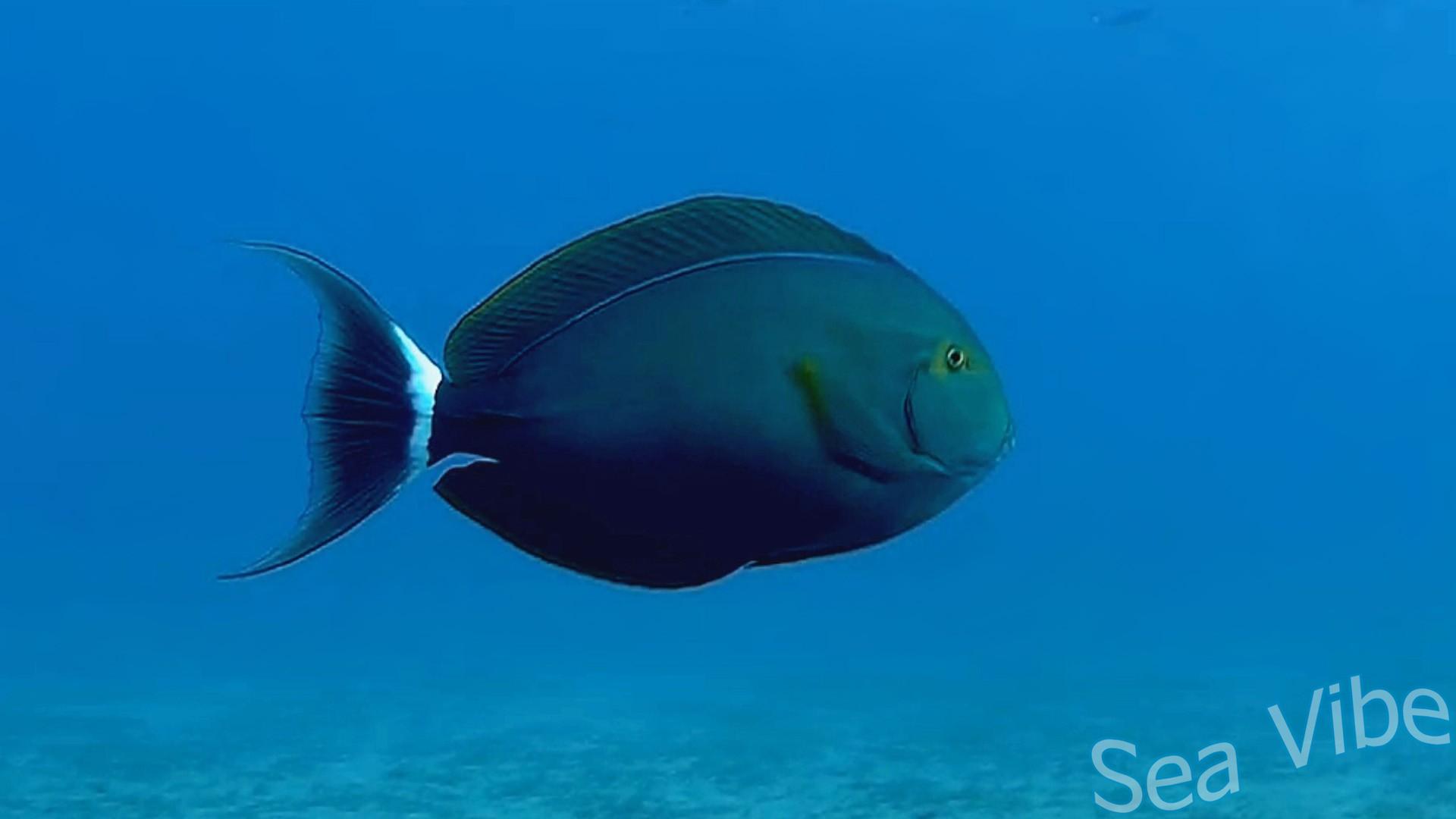 Окраска тела от черного до темно-коричневого цвета. Яркая, вертикальная белая полоса в начале хвостового плавника. Спинной и анальный плавники закруглены. Концы хвостового плавника вытянуты, образуя полумесяц. Желтая полоса вокруг глаз. Грудные плавники имеют желтые кончики.