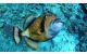 Жёлтая голова с тёмной, похожей на усы областью над верхней губой. Щаровидные глаза могут двигаться независимо друг от друга. Белое основание хвостового плавника и белая нижняя часть головы. Крупная верхняя челюсть вмещает два ряда зубов: четыре пары зубов во внешнем ряду, три пары — во внутреннем. В нижней челюсти — один ряд из трех пар зубов. Добыча, скрывающаяся в песке, добывается при помощи сильной струи воды из своей пасти. Рыба способна ворочать большие каменные глыбы с помощью своего сильного подбородка, чтобы достать спрятавшуюся там добычу.