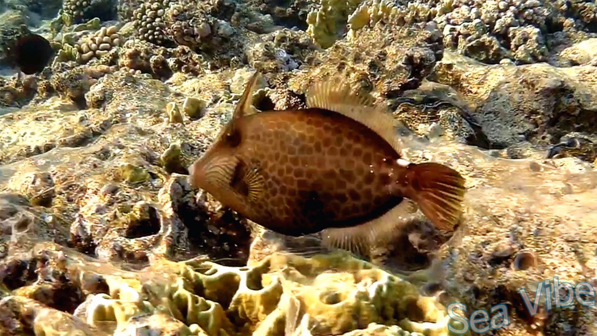Этот вид имеет три основных типа окраски: однородный темно-коричневый, пятнистый серовато-коричневый и серый фоновый цвет с сетью мелких полигональных отметин. Рыба способна менять интенсивность окраски в зависимости от настроения или окружающей среды. На голове от рта расходятся радиально серые полоски. У основания задней части второго спинного плавника имеется заметное белое пятно. Спинной и анальный плавники обычно прозрачные или желтоватые.