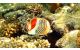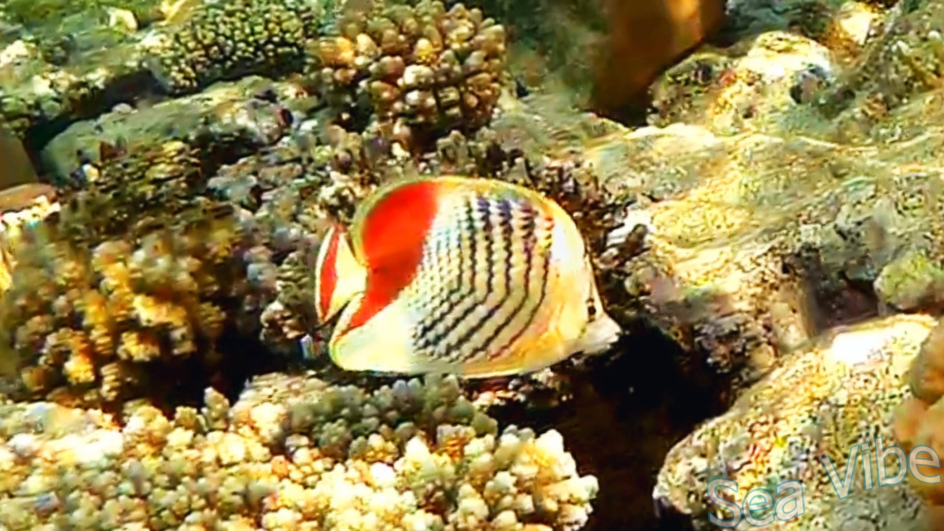 Желтоватое сплющенное по бокам тело с ярко выраженными чёрными полосами вдоль обеих сторон тела, переходящими в чёрные пятна ближе хвосту. Задняя часть тела и хвоста имеют красно-кирпичную окраску. Через глаза проходят чёрно-оранжевые полоски, а в верхней части головы расположена чёрная «корона» с белой каймой.