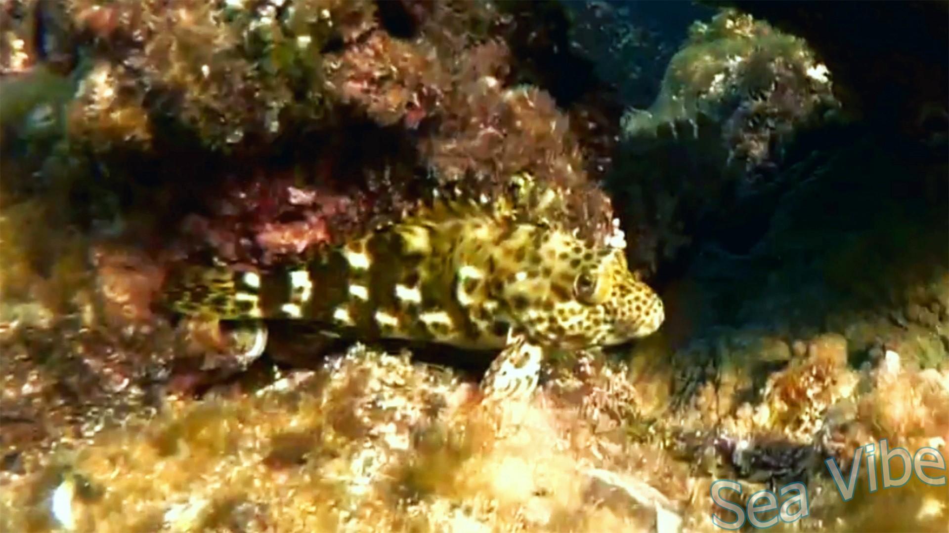 Окрас — сложный мраморный узор, состоящий из чередующихся коричневых, оливковых или серых пятен на более светлом (беловатом) фоне. По всему телу и плавникам разбросаны многочисленные мелкие красно-коричневые или оранжевые точки. На голове часто видны короткие извилистые линии и оранжевые пятнышки. Спинной плавник имеет характерные нитевидные отростки (кисточки) на концах лучей, что свойственно семейству кудреперовых.