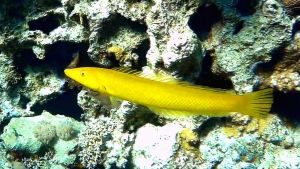 Окраска у этой рыбы изменчива: зеленая, коричневая, оранжево-коричневая или желтая, часто с узкой, среднебоковой, прерывистой черной полосой, которая отсутствует у крупных самцов. У крупных самцов может появиться ярко-желтое, оранжевое, черное, белое или разноцветное пятно на боках за грудными плавниками.