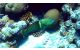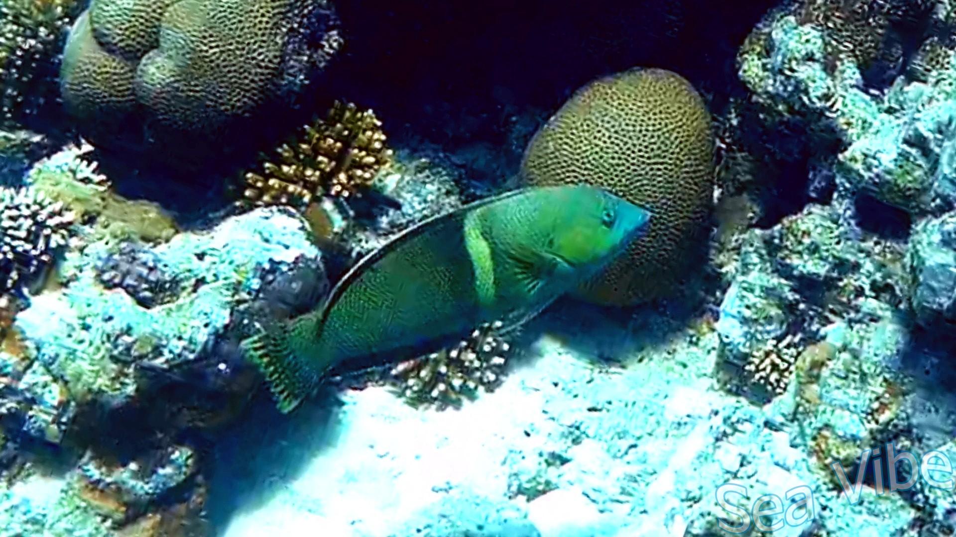 Самцы (терминальная фаза) тёмно-сине-зелёные, с черноватым оттенком, часто с бледно-зелёной полосой позади грудного плавника, за которой следует одна или несколько нечётких светлых полос по бокам, и удлинёнными передними шипами спинного плавника.
