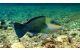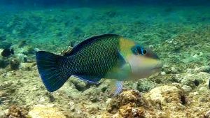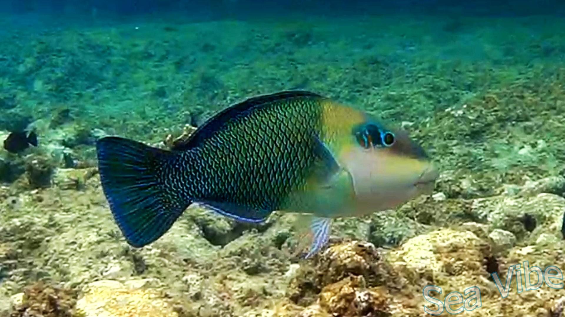 Взрослые особи преимущественно беловатые, бледно-зеленоватые или сероватые, спереди от диагональной линии между основаниями спинного и анального плавников, сзади черноватые или темно-зеленые, с узором из каракулей и линий на голове.