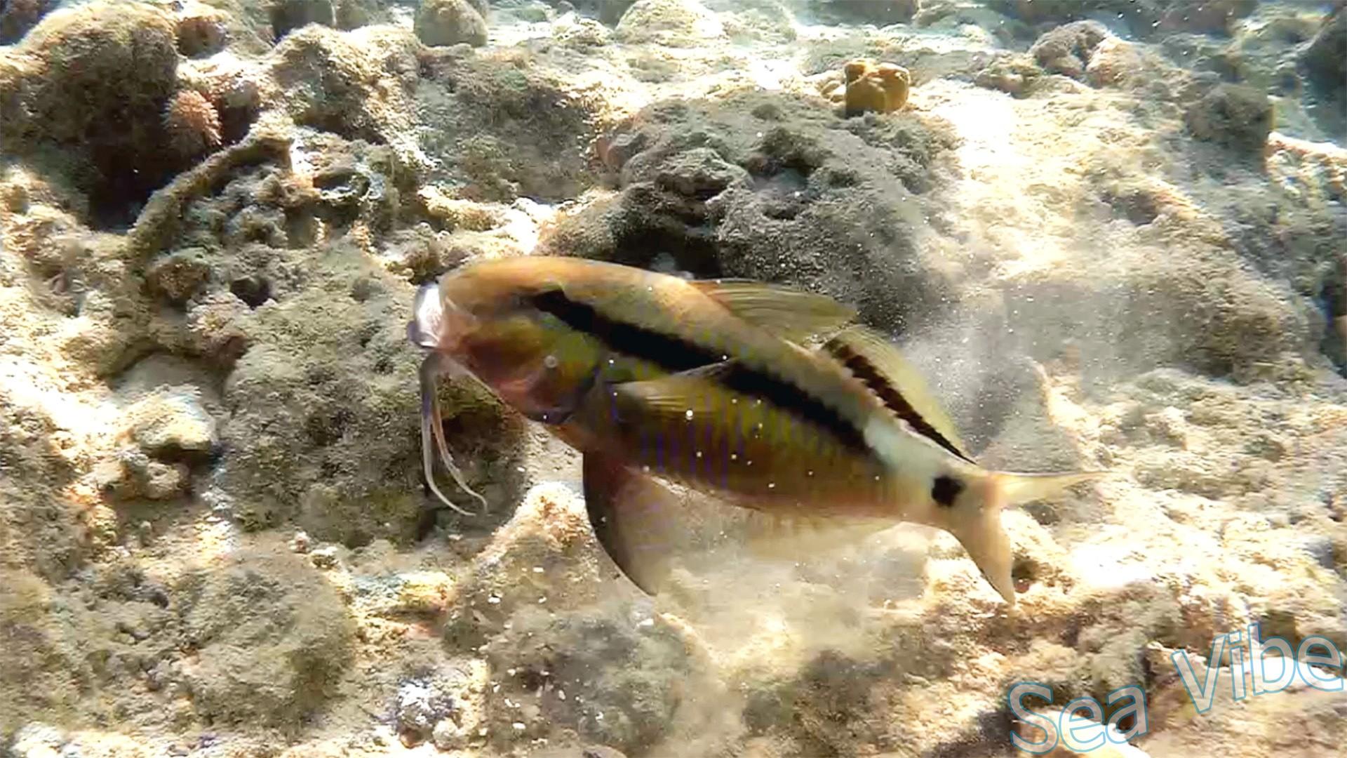 Тело серое до серовато-красного сверху, беловатое до розового снизу. Широкая темная полоса от глаза до хвоста и крупное черное пятно на хвостовом стебле. Спинные плавники и хвост часто желтоватые или с голубыми полосами. Два длинных белых усика на подбородке, часто превышающие длину головы. Первый спинной и хвостовой плавники красновато-серые, базальная треть или половина второго спинного плавника черная, темный пигмент продолжается до конца последнего луча.
