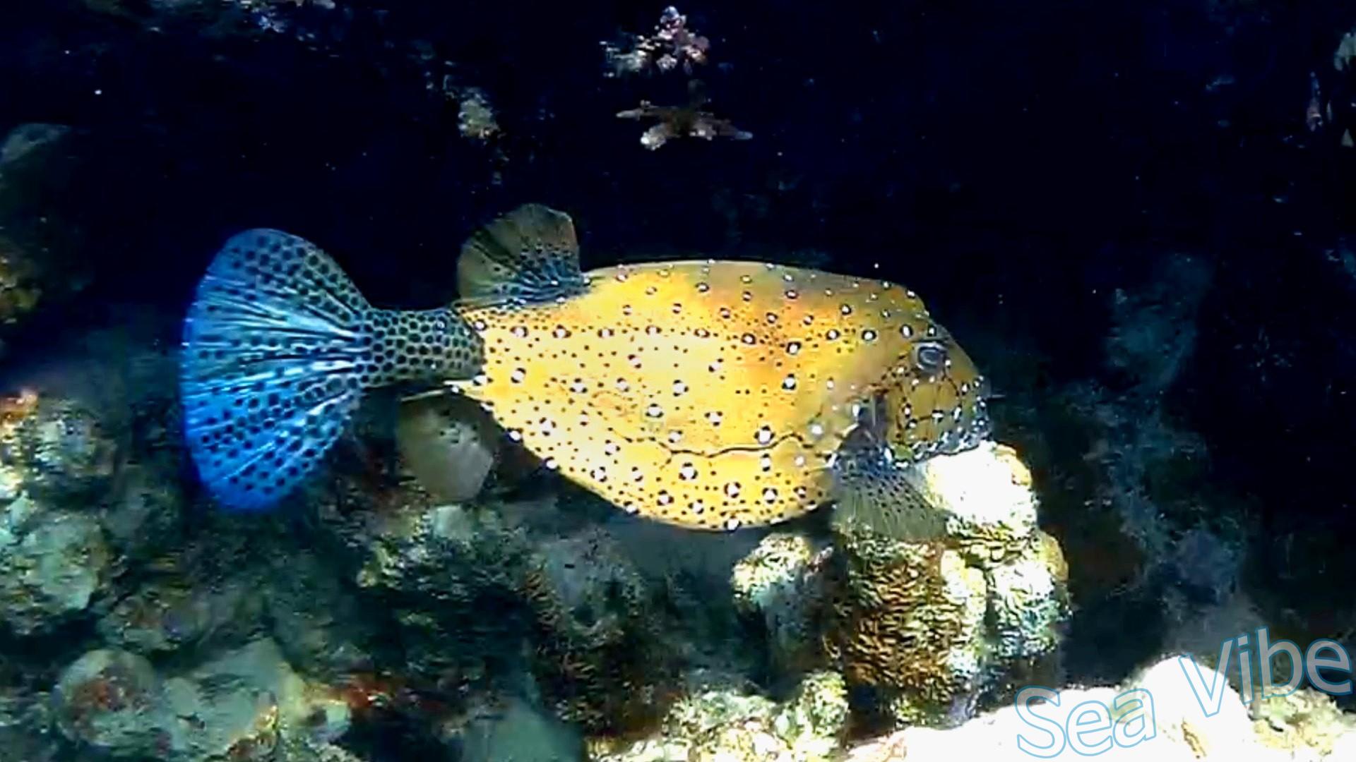 Среднерослые особи светло-коричневые с синими пятнами, окруженными черными пятнами или черной каймой. Более крупные взрослые особи горчично-коричневые с сине-зелеными оттенками и имеют выступ на верхней губе. Тело рыбы защищено экзоскелетом, представленным панцирем из сросшихся костных пластин. Дополнительным защитным механизмом помимо панциря является способность при опасности выделять токсичную слизь. У Ostracion cubicus синий хвост — это результат сочетания пигментов и структурной окраски. В клетках хвоста есть микроскопические структуры, которые по-особому отражают свет. На «синеву» хвоста влияет возраст, освещение, состояние рыбы, индивидуальные особенности.