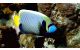 Окраска боков синяя или голубая с близкорасположенными узкими горизонтальными и диагональными жёлтыми полосами, заходящими на спинной и анальный плавники, передняя часть головы белая, через глаза проходит дугообразная чёрная с пурпурным оттенком и синими краями полоса, такого же цвета вертикально вытянутое пятно расположено над грудными плавниками. Передняя часть спины зелёная, верхний край спинного плавника и хвостовой плавник жёлто-оранжевые, брюшные и анальный плавники синие с продольными коричневыми полосами.