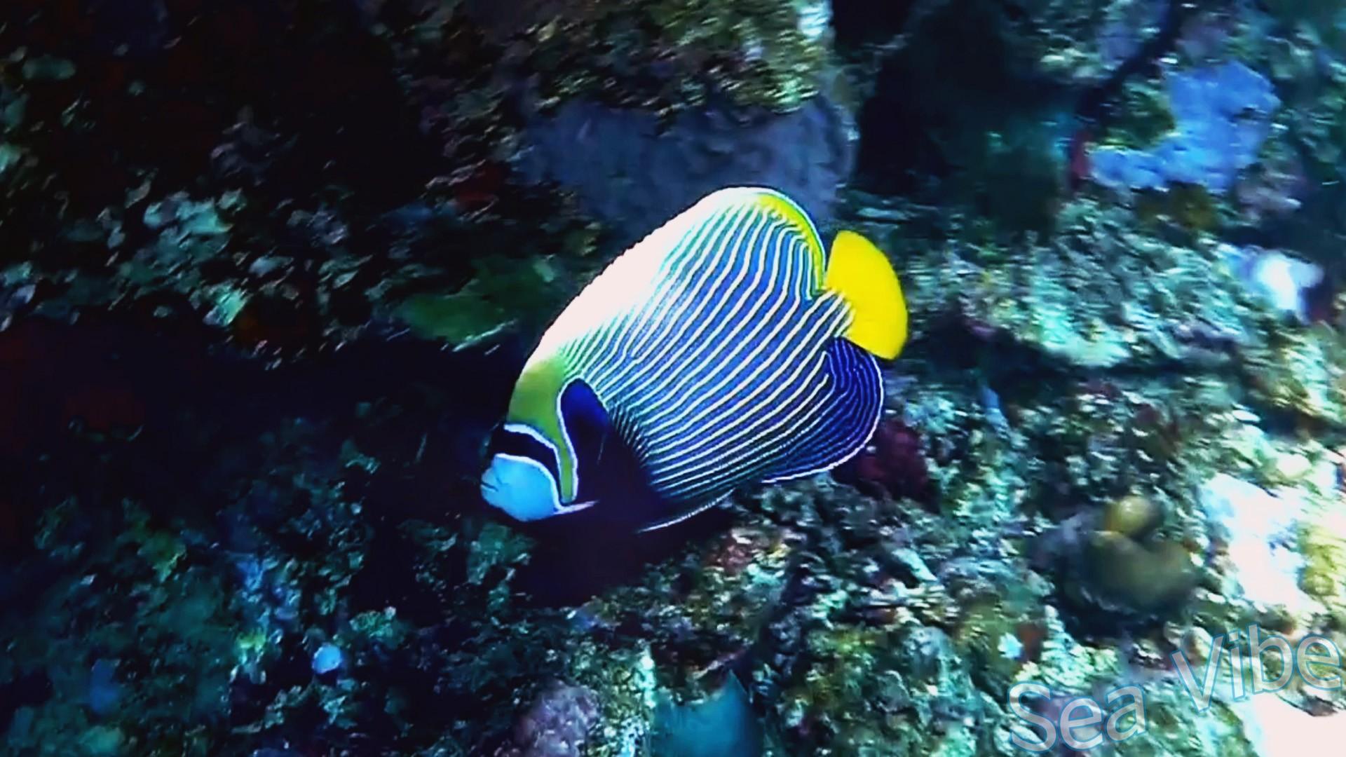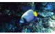 Окраска боков синяя или голубая с близкорасположенными узкими горизонтальными и диагональными жёлтыми полосами, заходящими на спинной и анальный плавники, передняя часть головы белая, через глаза проходит дугообразная чёрная с пурпурным оттенком и синими краями полоса, такого же цвета вертикально вытянутое пятно расположено над грудными плавниками. Передняя часть спины зелёная, верхний край спинного плавника и хвостовой плавник жёлто-оранжевые, брюшные и анальный плавники синие с продольными коричневыми полосами.
