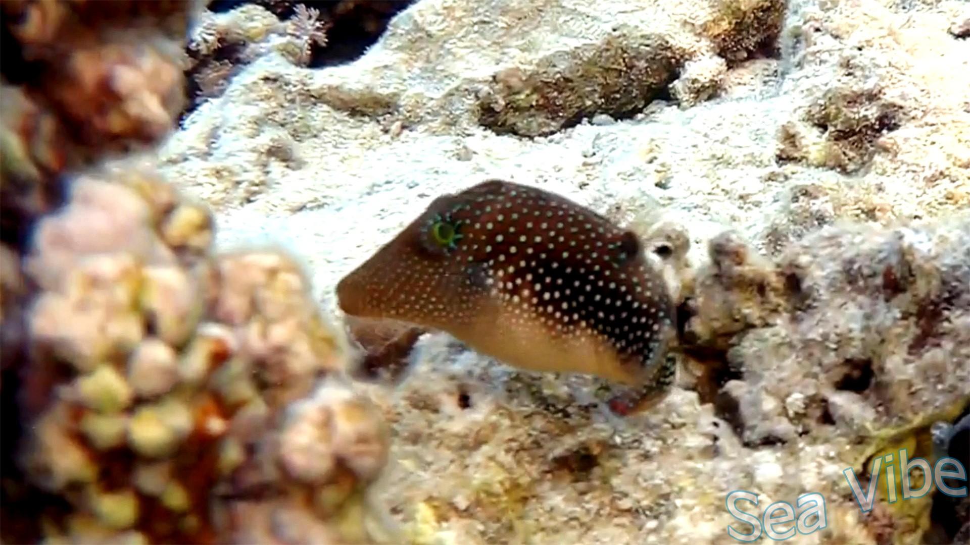 Отличительная особенность окраса - светлые точки на теле и на более светлом животе, в верхней части туловища от рта до спинного плавника имеются полоски. Ближе к спинному плавнику тело темнее и имеет бурую или практически черную окраску. Под спинным плавником имеется выступ, который украшен ложным глазом черного цвета.