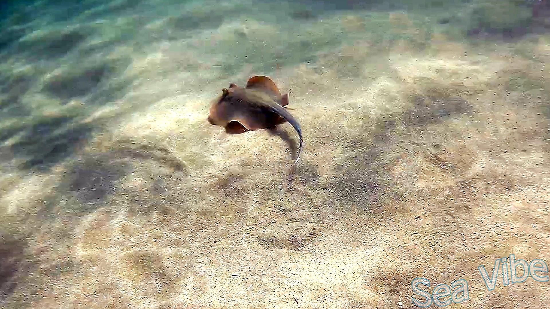 Синепятнистый скат хвостокол проплыл над Европейским морским языком. Морской язык испугался и уплыл.