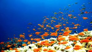 Морской голди (Pseudanthias squamipinnis), Зеленый хромис (Chromis viridis), Двухцветный хромис (Pycnochromis margaritifer) в бухте Абу Дабаб.