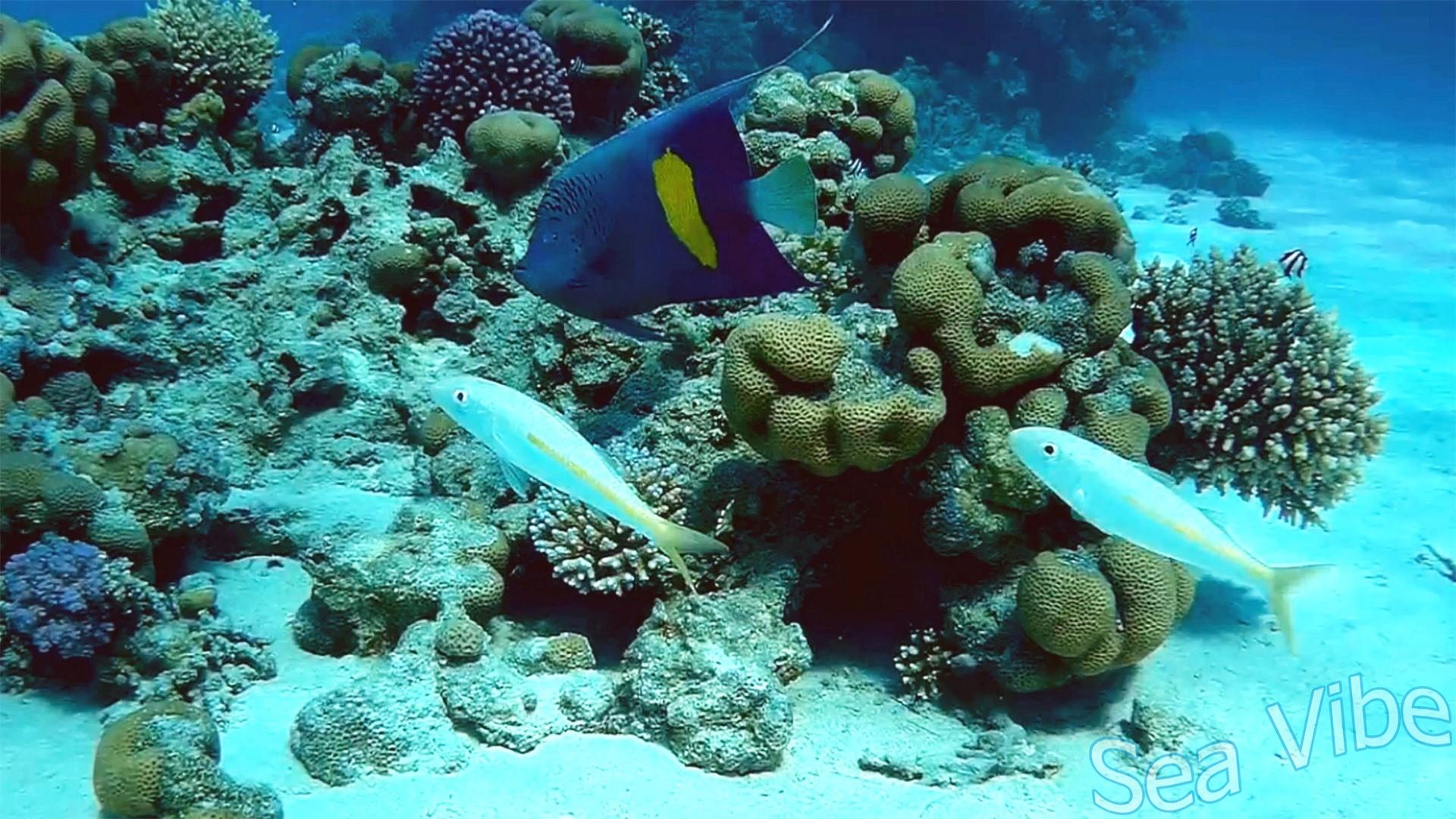 Желтополосый помакант (Pomacanthus maculosus) и Желтополосая барабуля (Mulloidichthys flavolineatus) в бухте Рас Ум Сид.