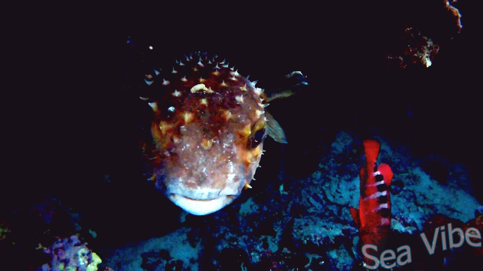 Желтопятнистый циклихт (Cyclichthys spilostylus) и Полосатый групер (Epinephelus fasciatus) спрятались под кораллом.