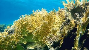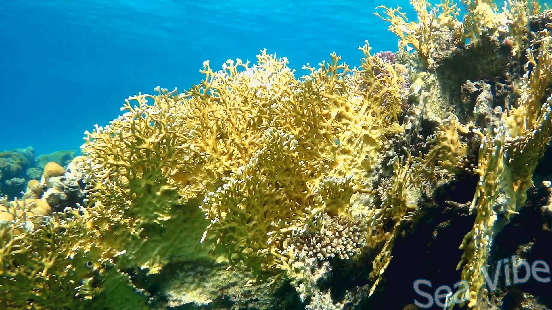 Net fire coral (Millepora dichotoma) and a Daisy parrotfish female nibbling on it.