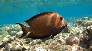 Coloration ranges from dark olive to yellowish-brown with longitudinal blue or blue-gray stripes on the body and small orange spots on the head and back of the head. The pectoral fins are light with brownish-yellow rays. A small blackish spot is present at the base of the dorsal fin in juveniles and small adults.
