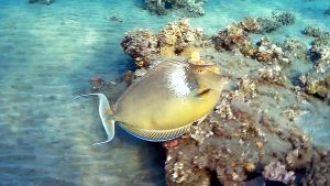 Mature fish are grey-brown. The caudal peduncle has two large, immobile, keel-shaped bony plates in adults, but these are absent in juveniles. The head of adult fish has a characteristic horn protruding forward above the eyes. It lengthens with age and is absent in young fish. Adult fish often have barbel-like extensions of the outer rays of the caudal fin.