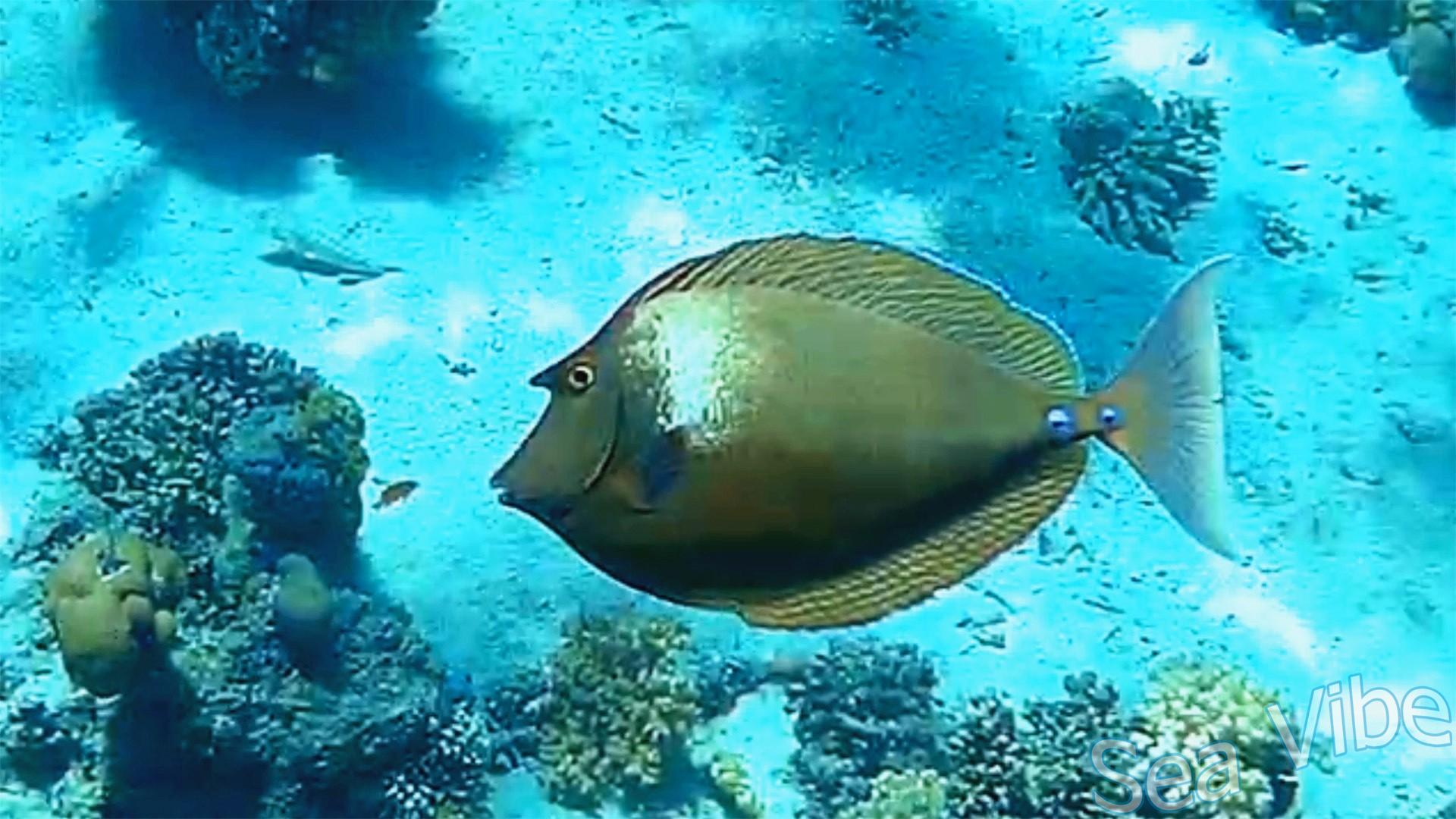 Mature fish are grey-brown. The caudal peduncle has two large, immobile, keel-shaped bony plates in adults, but these are absent in juveniles. The head of adult fish has a characteristic horn protruding forward above the eyes. It lengthens with age and is absent in young fish. Adult fish often have barbel-like extensions of the outer rays of the caudal fin.