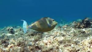 Mature fish are grey-brown. The caudal peduncle has two large, immobile, keel-shaped bony plates in adults, but these are absent in juveniles. The head of adult fish has a characteristic horn protruding forward above the eyes. It lengthens with age and is absent in young fish. Adult fish often have barbel-like extensions of the outer rays of the caudal fin.
