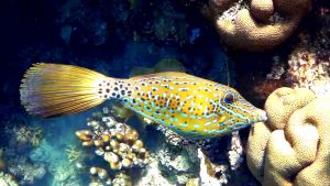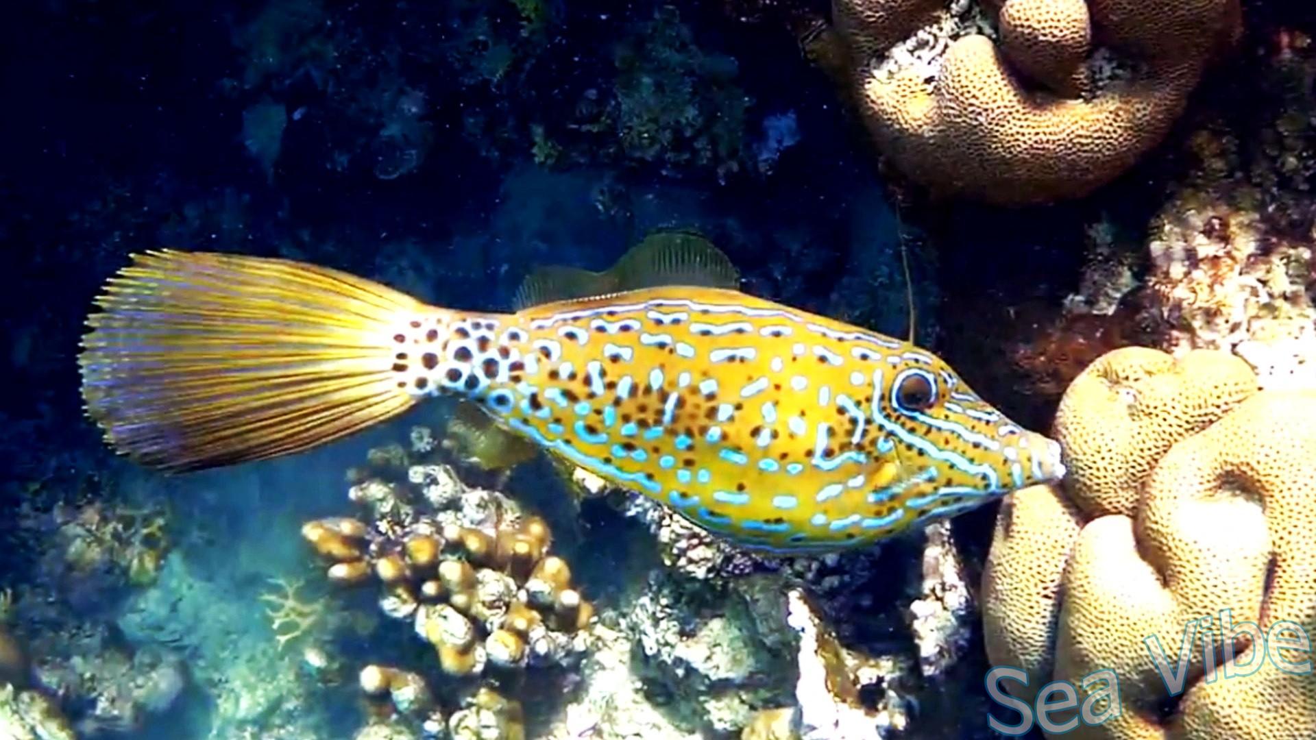 Body coloration ranges from olive-brown to gray or rusty with blue lines and spots. The snout is elongated with a noticeable concavity. The caudal fin is rounded.