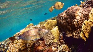 With two Scrawled filefish along the reef