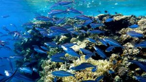 The back is bluish-green, the belly is white. A key feature is the presence of dark (often black or dark brown) longitudinal stripes on the upper flanks. The dorsal fin is long, and the caudal fin is forked and forked.
