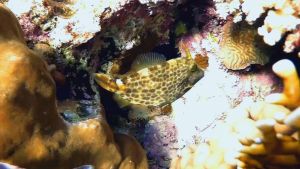 This species has three main color patterns: uniform dark brown, mottled grayish-brown, and a gray background color with a network of small polygonal markings. There is a noticeable white spot at the base of the back of the second dorsal fin.
