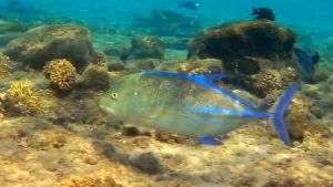 ead and upper body are copper-blue, covered with small bluish spots and black dots. The underside and belly are silvery-white. The second dorsal, anal, and caudal fins are bright blue. The pelvic fins are whitish. The pectoral fins are pale yellow.