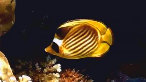 Yellow body with eleven diagonal stripes. On the head there is a vertical black stripe through the eye and an incomplete white stripe on the forehead. Dorsal, anal and caudal fins are yellow.