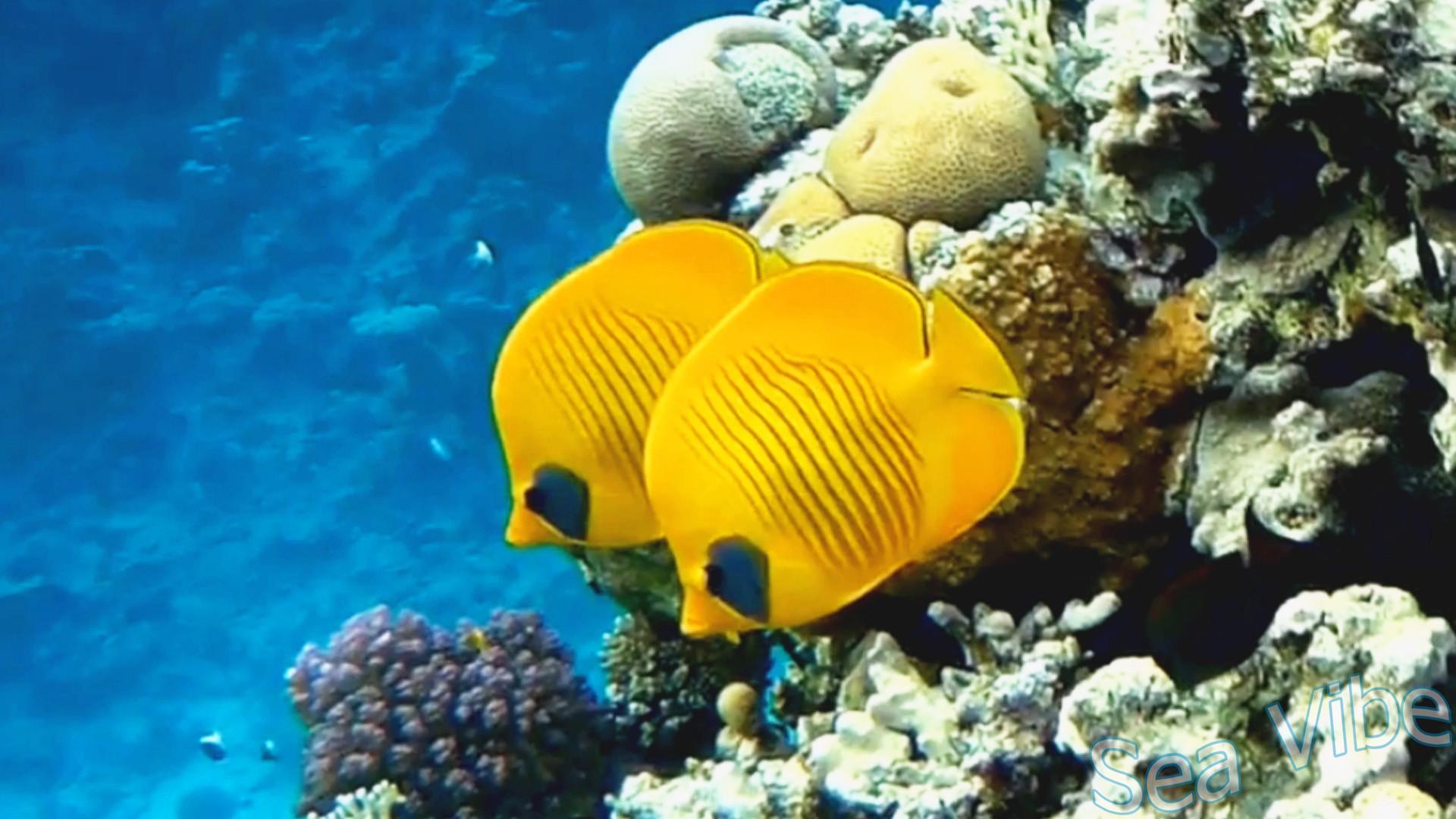 A bright yellow body marked with thin vertical orange-brown wavy stripes. There is a grayish spot behind the eyes. The dorsal, anal, pelvic, and caudal fins are yellow.