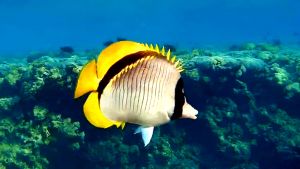 Lined butterflyfish and others. Body color Chaetodon lineolatus is white with a black elliptical marking along the edge of the posterior portion of the back extending across the caudal peduncle to the base of the posterior anal fin rays. A series of thin vertical black lines run across the sides, and a prominent vertical black band runs across the eye. The dorsal caudal and anal fins are bright yellow.