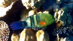 Adults have a large, bright green head with small spots. The lips are large and blue. The pectoral fins are yellow, and the pelvic, anal, and caudal fins are dark blue. The body is yellow-green, paler than that of the male, without a distinct yellow stripe. Closer to the gill cover is a distinctive bright yellow marking on a black background. The caudal fin is long and fringed. Females have large dark stripes on their sides