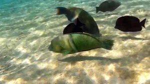 Males (terminal phase) dark bluish-green appearing blackish, often with a pale green bar behind the pectoral fin followed by one or more indistinct pale bars on side, and elongated anterior dorsal-fin spines.