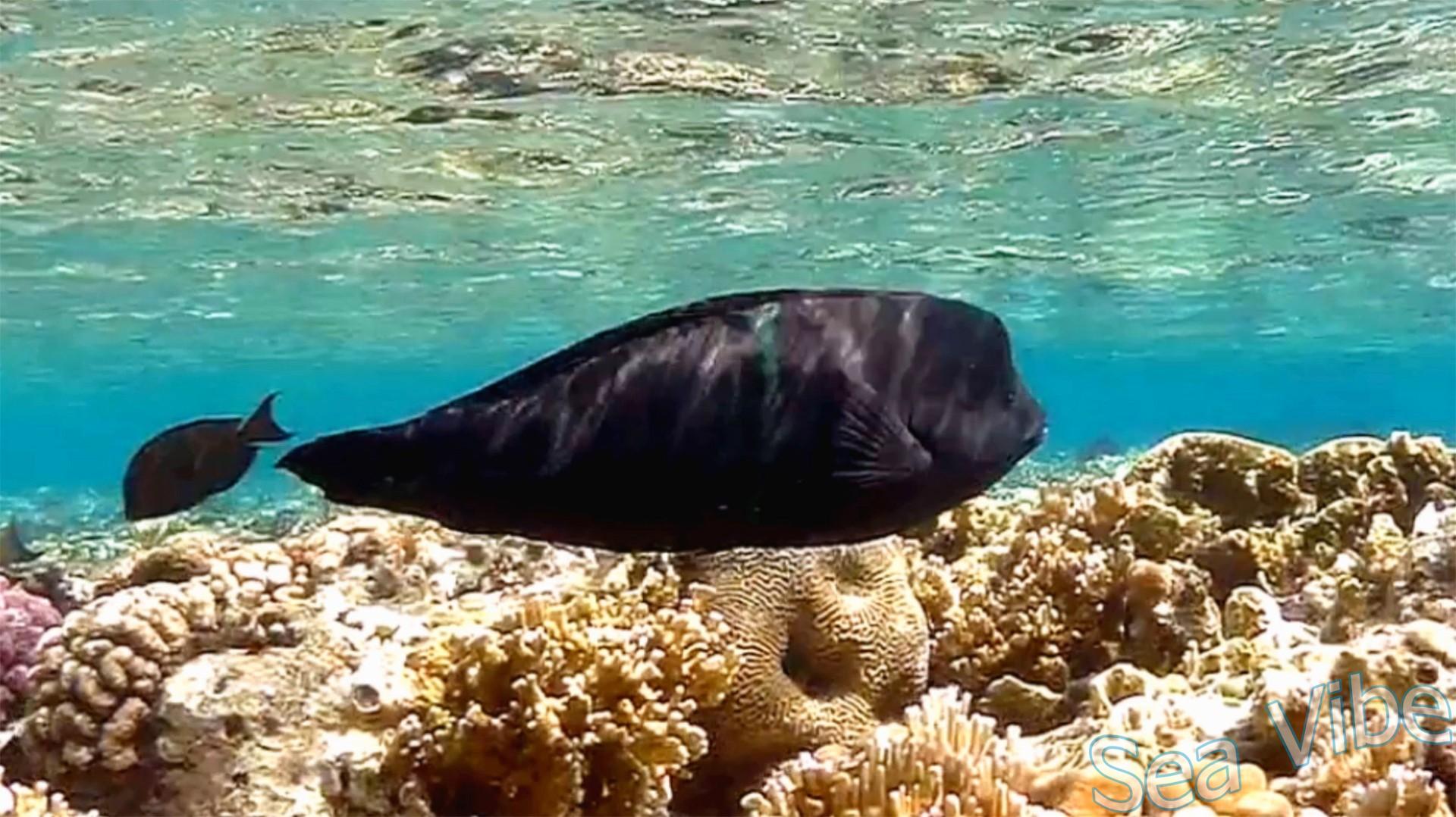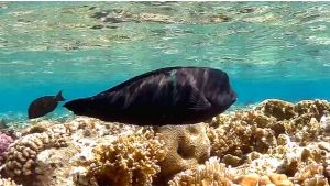 Males (terminal phase) dark bluish-green appearing blackish, often with a pale green bar behind the pectoral fin followed by one or more indistinct pale bars on side, and elongated anterior dorsal-fin spines. In adults, the forehead becomes very convex and rounded, forming a characteristic hump.