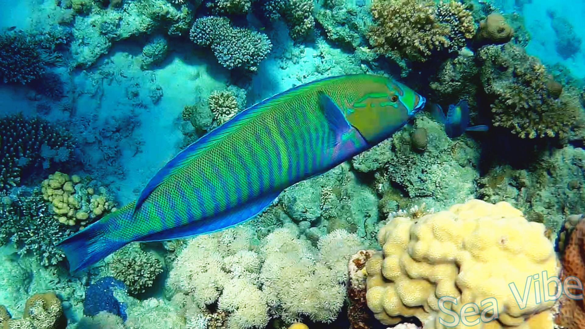 Males are mostly greenish with a blue face, the Indian form having a white stripe down the centre of the body. The body of males is marked with numerous blue-red stripes. The head is pale purple with green or blue-green stripes radiating from the eye.