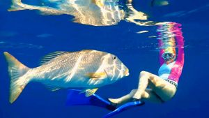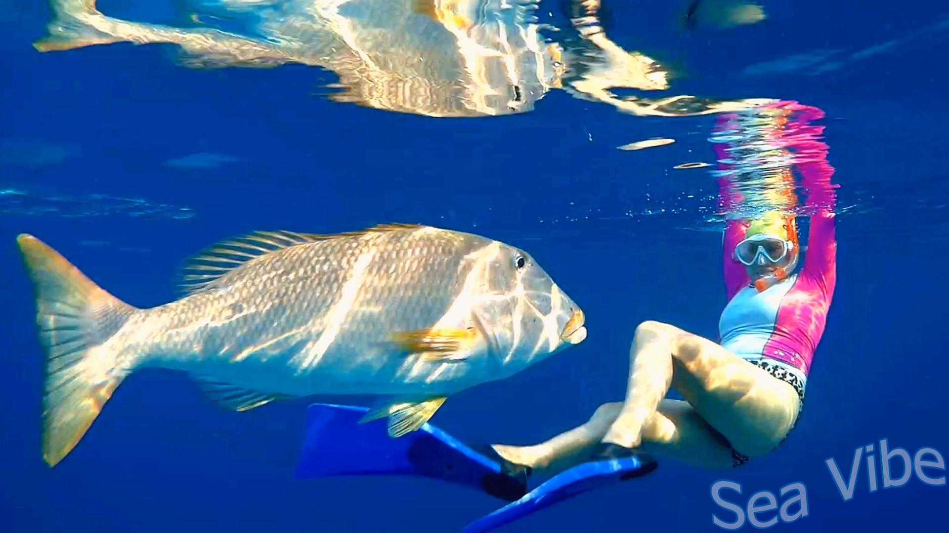Very curious Yellowlip emperor. Body colour is yellowish-grey with scattered irregular dark spots. The lips are yellowish, the upper lip is more intense. There is a red spot at the upper base of the pectoral fins, the fins are bluish-grey and spotted, the bases of the fins are lighter, and the edges of the dorsal and caudal fins are reddish.