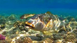 Body colour is yellowish-grey with scattered irregular dark spots. The lips are yellowish, the upper lip is more intense. There is a red spot at the upper base of the pectoral fins, the fins are bluish-grey and spotted, the bases of the fins are lighter, and the edges of the dorsal and caudal fins are reddish. Feeds mainly on crustaceans, fishes, and echinoderms.