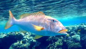 Body colour is yellowish-grey with scattered irregular dark spots. The lips are yellowish, the upper lip is more intense. There is a red spot at the upper base of the pectoral fins, the fins are bluish-grey and spotted, the bases of the fins are lighter, and the edges of the dorsal and caudal fins are reddish.