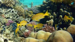 The back and sides are bright yellow, the lower part of the head and belly are whitish. Four bright blue stripes run along the body. There are several grayish stripes on the underside of the body. The fins are yellow.