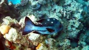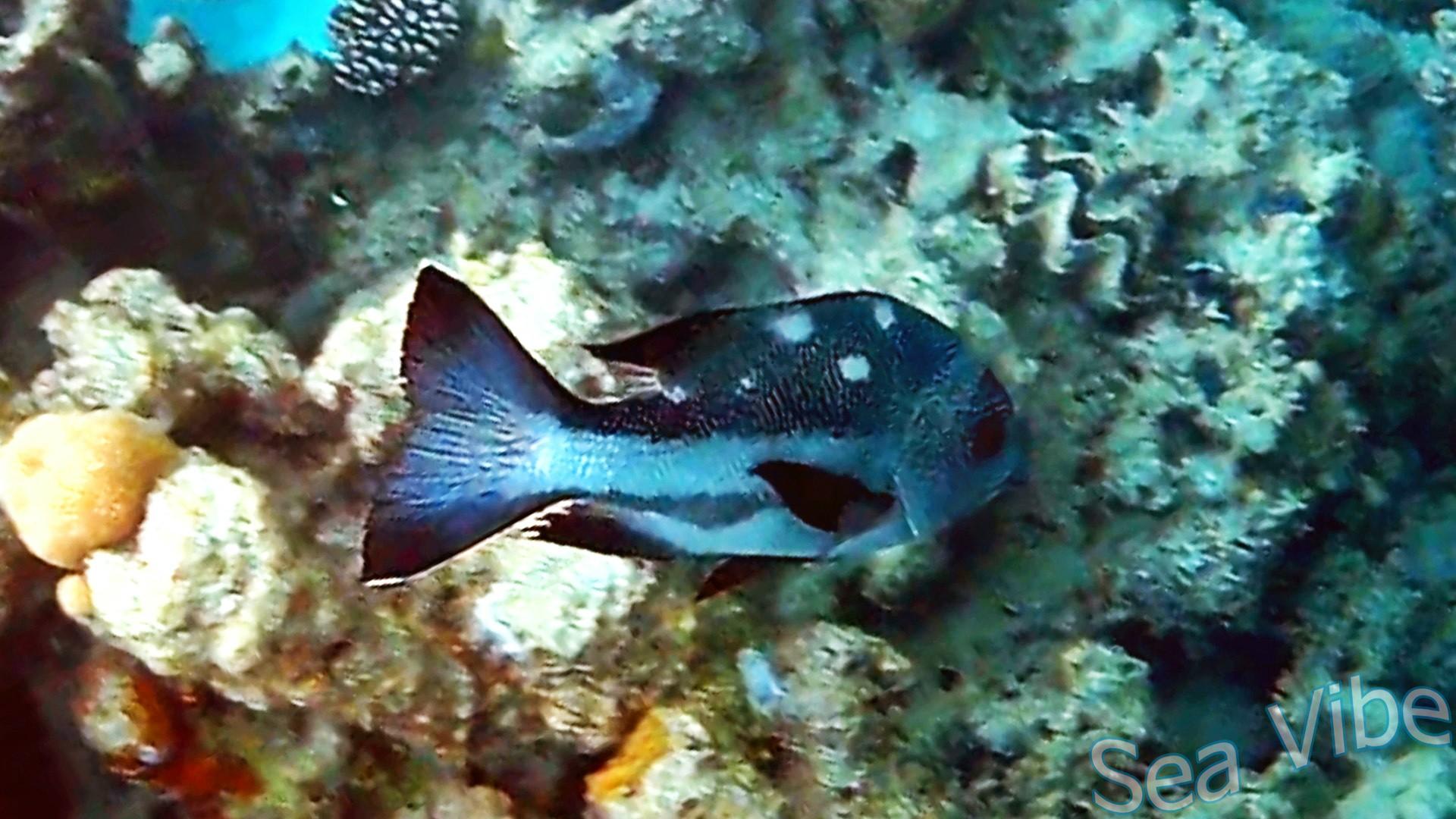 Adults are predominantly dark brown or black in colour. Juveniles up to 24 cm long have alternating black and white stripes on the sides of their bodies. The upper part of the body is black with 5 (4-7) white spots. The tips of both lobes and the middle part of the caudal fin are white. A vertical black stripe runs through the eye.