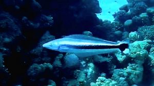 The head and forebody are blue. There is a wide black lateral stripe that extends from the base of the pectoral fin. Adults have a fine lattice pattern on the upper back, with a white area in the middle of the posterior edge of the caudal fin. A light line runs along the upper edge of the grayish dorsal fin, the anal and pelvic fins are white, and the pectoral fins are bluish.