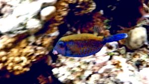 Adult males are typically dark blue with spots on the sides and underparts and greenish-yellow on the upperparts, unspotted. Females are yellow with blue spots and red cheeks. Females have a slightly concave dorsal profile of the head, while males have a convex profile.
