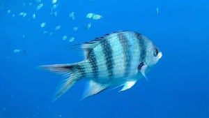Scissortail sergeant has a white body with five vertical black stripes. Two horizontal stripes are located on the tail lobes. This fish gathers in large schools over corals.