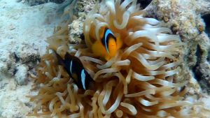 Body is yellow-orange or brownish in colour with two characteristic white vertical stripes with a black border. The first stripe behind the head is wider than the second, located in the middle of the body. The caudal fin is always yellow. In some individuals the colouring becomes very dark, in low light underwater the yellow may appear grey or almost disappear, young or stressed individuals may be almost completely dark. They live in symbiosis with sea anemones.