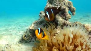 The body is yellow-orange or brownish with two characteristic white vertical stripes edged in black. The first stripe behind the head is wider than the second, located in the midsection of the body. The caudal fin is always yellow. In some individuals, the coloration darkens significantly; in low light underwater, the yellow may appear gray or almost disappear; young or stressed individuals may be almost completely dark. They coexist symbiotically with sea anemones. In Amphiprion bicinctus, females are usually darker and larger than males. They have a rich orange-brown or even dark brown hue, while males are brighter and more orange. Like all clownfish, they are hermaphrodites: smaller males can become females if the dominant individual dies.