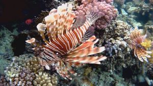 The color varies from reddish to brown and gray, there are numerous thin transverse dark stripes on the body and head. The dorsal fin has 13 long, strong spines and 9-11 soft rays. The thorns are extremely poisonous, a sting from a lionfish thorn can lead to death.