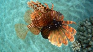The color varies from reddish to brown and gray, there are numerous thin transverse dark stripes on the body and head. The dorsal fin has 13 long, strong spines and 9-11 soft rays. The thorns are extremely poisonous, a sting from a lionfish thorn can lead to death.
