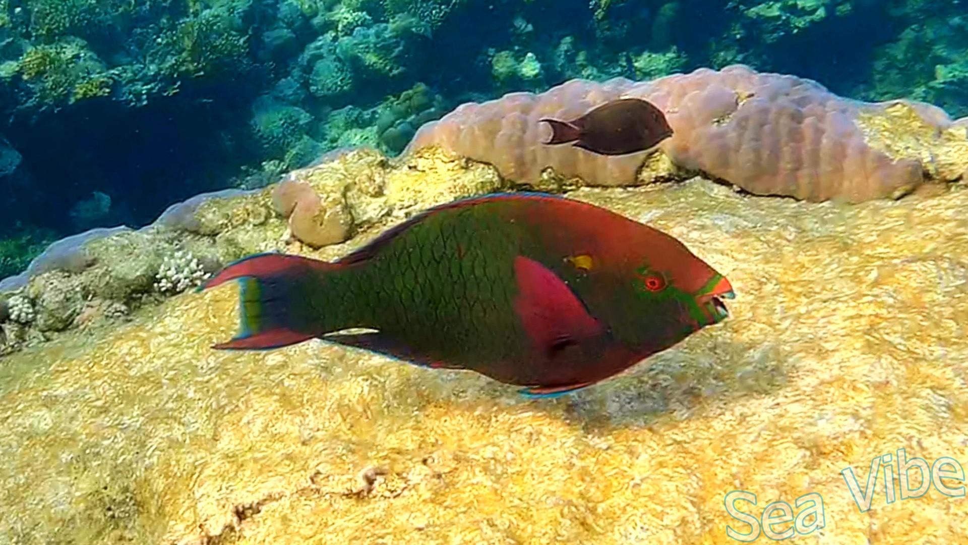 The male is reddish-brown anteriorly with a red upper lip and dark stripes around the mouth, and greenish posteriorly with dark scale edges. The dark scale edges create a reticulated pattern. Dark stripes surround the mouth. A key feature is a bright green or yellowish spot with a dark border above the eye. The dorsal fin is yellow-green or reddish. Unlike females, male Scarus niger appear greener and more contrasting.