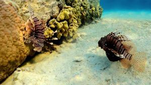 The coloration varies from reddish to brown and gray, with numerous thin transverse dark red-brown and white stripes on the body and head. The dorsal fin has 13 spines and 9 to 11 soft rays. The spines are extremely venomous, a sting from a lionfish spine can be fatal.