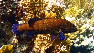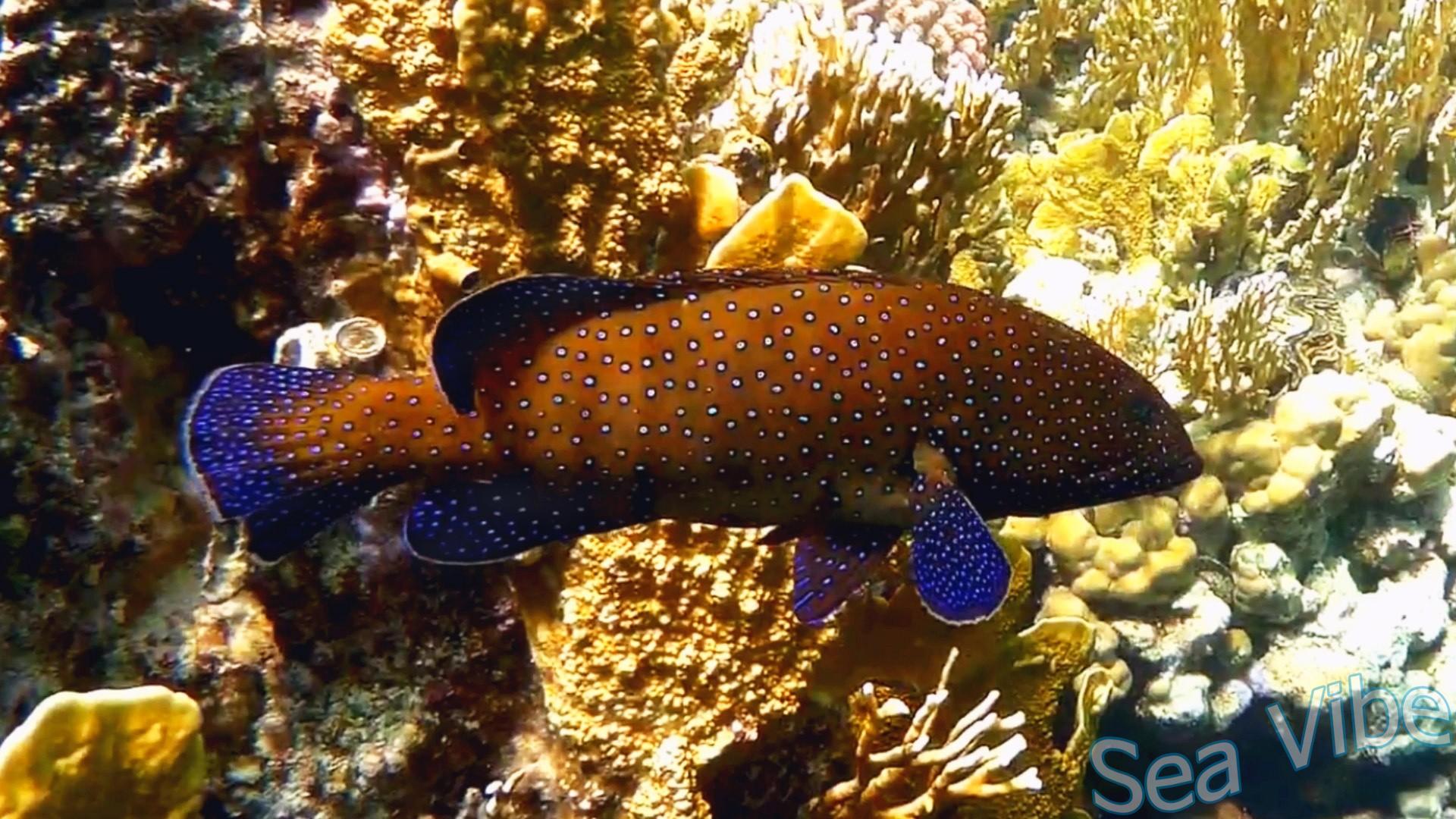 Body and head are dark brown, covered with numerous small blue spots of an eye shape with a black border. There are 5-6 pale transverse stripes along the back of the body. There is a large pale area on the chest. The back edge of the pectoral and pelvic fins usually has a narrow white edge.