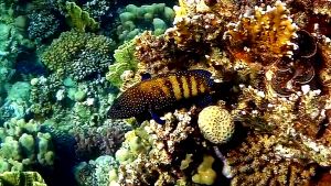 The body and head are dark brown in color, covered with numerous small blue eye-shaped spots with a black edging. There are 5-6 pale transverse stripes running along the back of the body. There is a large pale area on the chest. The posterior edge of the pectoral and pelvic fins usually has a narrow white edge.